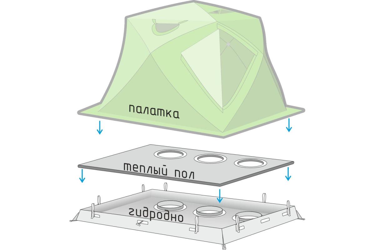 Это специальное дно, которое защищает как от воды, так и сохраняет тепло. В данном дне есть специальные отверстия под лунки, нужно данное дно для того, чтобы хорошо гидроизолировать и теплоизолировать пол в палатке.
